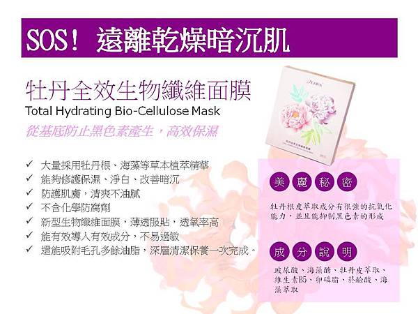 配方延續牡丹系列,設計的理念仍是簡單、無添加,但是有保濕的黃金配方,讓肌膚自然回到嫩白靓麗的狀態